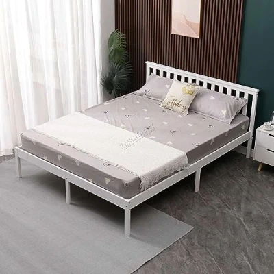 ManoManoGeneral description The WestWood Double Bed is a classic and essential piece of bedroom furniture, crafted from high-quality solid pine wood. This durable bed frame is designed to enhance your room's decor while providing stable and comfortable support. Technical specifications Material: High Quality Pine Wood Color: White Product Size: Double Overall Dimensions: 198 x 143 x 82 cm (L x W x H) Bed Height: 34 cm Leg Height: 25 cm Max Load Capacity: 200 kg Headboard Dimensions: 143 x 82 cm (W x H) Bed Dimensions: 190 x 135 cm (L x W) Carton Size: 1050 x 400 x 200 mm Net Weight: 20 kg Gross Weight: 21 kg Installation The bed is delivered flat packed, including the bed frame and slats, along with instructions and an assembly kit. You can easily set up the bed by yourself without much effort. Usage The bed features a 25 cm gap underneath, providing additional storage space for boxes. It is designed with a headboard, allowing you to sit up comfortably for activities like watching TV,