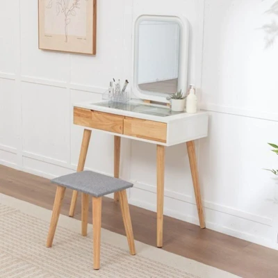 ManoMano" Product Features: * This dressing table combines a soft white finish with natural wood tones, adding a calm and modern charm to your room. The rectangular rounded-corner mirror design enhances the overall balance and elegance. * The left side features three divided compartments ideal for small accessories or makeup essentials, while the right drawer offers a larger space for bigger items, keeping everything neat and accessible. * Switch between warm, natural, and cool white lighting with a gentle tap. Adjust brightness effortlessly to suit different times of day or makeup needs. * With a total height of 140cm and a desktop width of 80cm, this dressing table is ideal for bedrooms of all sizes small enough to fit in tight corners yet spacious enough for daily makeup storage. * Crafted from premium MDF and solid wood legs, ensuring stability and long-lasting use. Designed with care to blend beauty and practicality. Product Specification: * Model No.: WW-DT24; * Color: Natural / White;