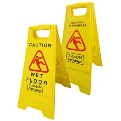 Wet floor caution sign Free standing, A-frame design Ideal for public places such as shops and bars Printed with 'CAUTION, WET FLOOR, CLEANING IN PROGRESS' Provides customers with warning of slippery floors