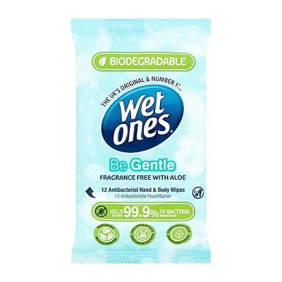 These biodegradable wipes are made from plant-sourced fibres, containing zero plastic so you don't have to worry about unnecessary waste. Designed to kill 99.9% of bacteria, Wet Ones Be Gentle Wipes are fragrance-free, dermatologically tested and contain Aloe for a fresh clean feel that's even suitable for sensitive skin. · Biodegradable wet wipes · Suitable for hands, face and body · Kills 99.9% of bacteria · Fresh fragrance · No plastic · Contains Aloe - kind to sensitive skin · Travel sized - perfect for holidays and travelling · 12 wipes per pack