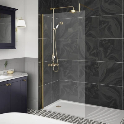 Wet Room Screen with Brass Support Bar 700mm Wide 8mm Glass Hudson Reed
