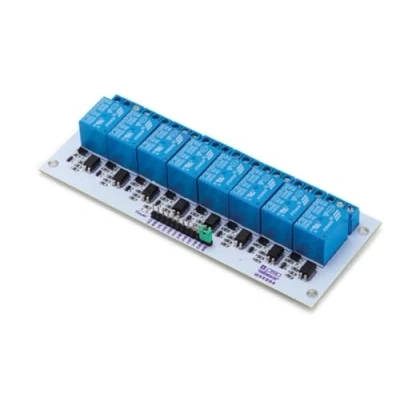 This 8-channel relay interface board can control various appliances and other equipments with high current. It can be controlled directly by any micro-controller. Control input voltage: 5 - 12 VDC / Relay output: 250 VAC 10 A; 30 VDC 10 A (non-inductive) Control input current (in1 to in4): 5 - 25 mA Operating voltage: 5 V Dimensions: 57 x 138 mm, Weight: 0.3747858454 pounds, Manufacturer: Velleman