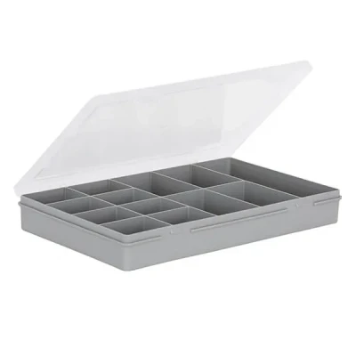 High Quality Compartmental Storage Organiser Soft Grey Size L29cm x W19cm x H4cm 13 Fixed Compartments in 3 Sizes - 8 Small, 4 Medium, 1 Large Small Compartment Size: 5.5cm x 4cm x 3.4cm, Medium Compartment Size: 5.3cm x 8.5cm x 3.4cm, Large Compartment Size: 17cm x 5.3cm x 3.4cm See Through Lid with Secure Clasps Keeps Contents Divided in Transit Stackable With Each Other and All Other Wham 3.XX Organiser Boxes Made from Quality Strong and Sturdy Recycled Single Use Plastic in the UK
