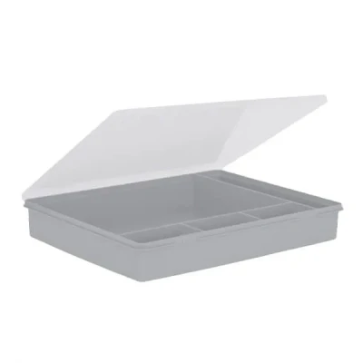 The Wham Organiser Box 5.03 38cm with 5 Divisions Soft in Grey/Clear is perfect for keeping your arts, crafts and knick knacks organised and tidy to avoid mess and clutter.The secure hinged lid is see through so it allows you to find what you are looking for, and clips down to keep it closed.Dimensions: 6(H) x 30(W) x 38(D)cm. Weight: 0.678kg.