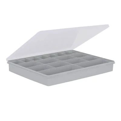 AmazonHigh Quality Compartmental Storage Organiser, Soft Grey Designed for storing small and fiddly DIY, craft and everyday items 18 fixed compartments in 3 sizes - 8 small, 8 medium, 2 large See through lid with secure clasps keeps contents divided in transit Stackable; Made from quality strong and sturdy recycled single use plastic in the UK