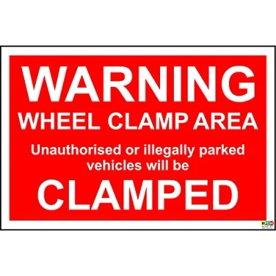 Wheel Clamp Area Unauthorised Illegally Parked Vehicles Clamped Sign 1.2mm rigid plastic 300mm x 200mm Digitally printed and laminated for extra durabillity Drill and screw in position or use double sided tape to mount onto suitable surface.