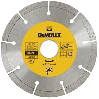 General description The Dewalt DT3711-QZ is a high-performance 125mm dry diamond cutting disc designed for fast cutting with a segmented rim. It is ideal for general construction materials such as building blocks, paving blocks, and concrete. Technical specifications Diameter: 125 mm Hole diameter: 22.2 mm Segment thickness: 7 mm Performance: Extreme cutting capabilities Compatibility and accessories Suitable for use with angle grinders and compatible power tools All blades up to 230 mm diameter have a 22.2 mm bore; the 300 mm blade has a 20 mm bore for use with gasoline chainsaws Installation Ensure the tool is unplugged before installation Attach the blade securely to the tool's arbor, matching the bore size Check that the blade is properly aligned and tightened before use Usage Use appropriate personal protective equipment such as gloves and eye protection Operate at recommended speeds for safe and efficient cutting Apply steady pressure during cutting; do not force the blade