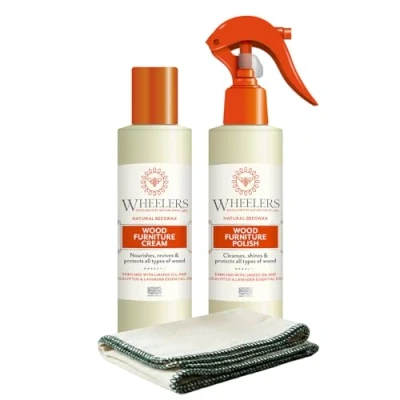 SPRAY EFFORTLESSLY LIFTS HIDDEN DIRT TO RESTORE YOUR FURNITURE - with a simple spray and wipe, Wheelers wood polish cleans beneath the surface and lifts hidden dirt that dulls the look and feel of wood, bringing back its natural shine CREAM PROTECTS YOUR WOODWORK'S NATURAL SILKY FINISH - crafted with natural beeswax to nourish and protect, Wheelers cream wood cleaner penetrates tired wood and revives its beauty ONE KIT FOR ALL YOUR WOODEN DECOR - from antique cabinets to everyday dining tables, as well as bookcases, shelves, coffee tables, doors and wardrobes, use the beeswax polish and cream, with our finest quality 100% cotton cloth to revive all your cherished pieces. Restores all types of wood NATURAL TREATMENT WITH BEESWAX - your home's woodwork deserves the best care. Crafted with beeswax and linseed oil, this non-toxic beeswax polish for wood rejuvenates the beauty of your furniture without using harsh chemicals, and is safe to use around pets EXCELLENCE BY NATURE SINCE 1983 - Wheelers is the finest choice when it comes to protecting, nourishing and caring for luxury leather and wood. Made in the UK with natural ingredients like beeswax and essential oils that are kind to you and your home