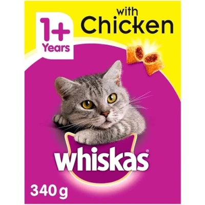 Whiskas 1+ Dry cat food is a nutritionally complete and balanced meal for your adult feline. This adult cat food contains tasty filled pocket kibbles they will love - crunchy on the outside with a soft and delicious centre. Whiskas 1+ quality dry cat food provides everything your adult cat nutritionally needs for a long and happy life. Whiskas delicious cat food meals and cat treats are formulated for your cat's diet. A 100% Complete and Balanced cat food of Chicken dry cat kibbles. This 340g Whiskas dry cat food for adult cats has tasty filled pockets your feline friend will love.INGREDIENTS: Cereals, Meat and Animal Derivatives (29%, including 4% Chicken in the Light Brown Kibbles*), Oils and Fats, Derivatives of Vegetable Origin, Minerals, Vegetable Protein Extracts, Vegetables (including 0.5% Dried Carrots (equivalent to 4% Carrots) in the Orange Kibbles and 1% Dried Peas (equivalent to 4% Peas) in the Green Kibbles*).*Light Brown Kibble typically 49% of product, Orange Kibble and Green Kibble both typically 8% of product eachANALYTICAL CONSTITUENTS: Protein 30.0%, fat content 12.4%, inorganic matter 8.2% crude fibres 1.8%, omega 6 fatty acids 2.6%Technical Specification:Age: Adult Flavour: Chicken Type: Dry