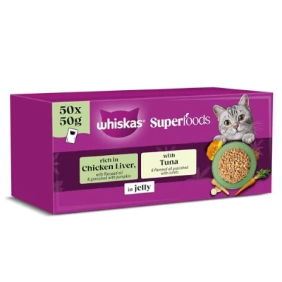 WHISKAS 1+ SUPERFOODS MIXED Selection Wet Cat Food Pouches in Jelly 50 x 50g
