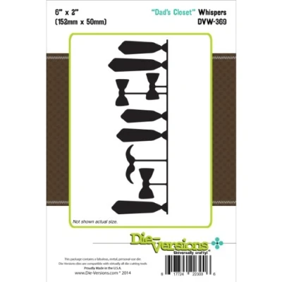 Die-Versions - Whispers - Dads Closet size 6 x 2 - 152x50mm. Die-Versions are thin, chemically-etched metal dies, used to cut out letters and shapes from a variety of materials. They are designed to cut cardstock, vinyl, vellum, foam, thin chipboard, cork, metallic paper, felt and more. Each die comes with a piece of ejection foam. MPN