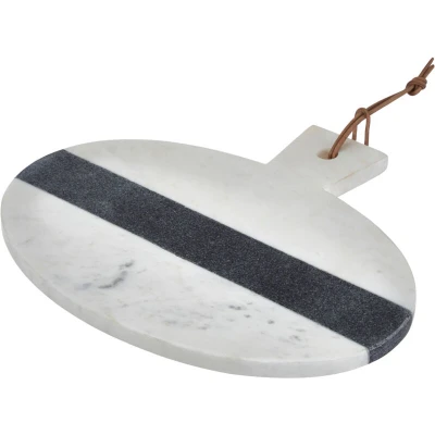 General description This Serving Board features a striking dark grey stripe on its white marble surface, enhanced by light veining. It is both decorative and functional, designed to add a monochrome effect to your dining table or kitchen. Technical specifications Material: Marble Color: White with dark grey stripe Usage Ideal for serving food and appetizers Can be used as a decorative piece in the kitchen or dining area Other information Includes a handle for a secure grip Features a hanging hole with a natural colored string for easy storage