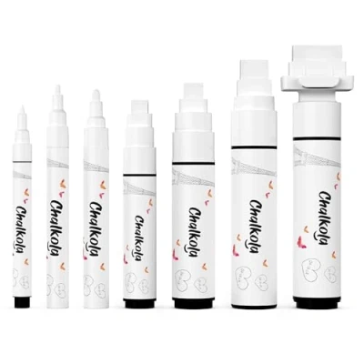 All in one set of white chalk markers (thin and thick point) - Time to replace the old dusty chalk with white chalk ink marker Ultimate Freedom of Expression - Chalkola’s chalk paint markers are great to decorate wedding signs, shop storefront, milestone boards, menus, LED boards, contact paper, car mirrors. Made for Everyone - Whether you're a Teacher, Mom, Student, Artist, Kid, Business, Office or Restaurant Owner our white liquid chalk ink markers make creating beautiful messages effortless. Comes off Easy - Our water-based ink is washable and delivers smudge free flowing lines. A mere wipe of a wet paper towel will remove your finished ink easily from any non-porous surface & the ink is Permanent on porous surfaces Mess-Free - These liquid chalk pens are washable, dustless, non-toxic and safe for use at home
