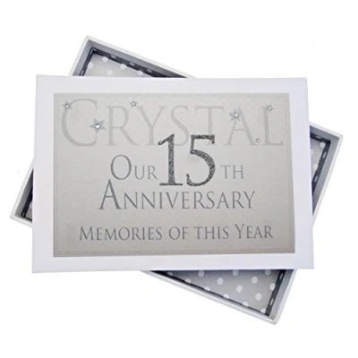 Beautiful handmade 15th Crystal Anniversary Memories of This Year, Glitter & Words, photo album Presented in a white gift box with a clear perspex lid Includes 16 pockets to hold up to 32 photos Hand finished with gorgeous diamantes and sparkling glitter The perfect gift for your special occasion