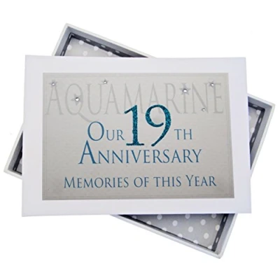 Beautiful handmade 19th Aquamarine Anniversary Memories of This Year, Glitter & Words, photo album Presented in a white gift box with a clear perspex lid Includes 16 pockets to hold up to 32 photos Hand finished with gorgeous diamantes and sparkling glitter The perfect gift for your special occasion