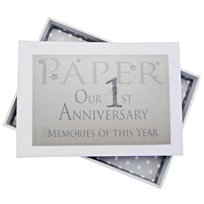 Beautiful handmade 1st Paper Anniversary Memories of This Year, Glitter & Words, photo album Presented in a white gift box with a clear perspex lid Includes 16 pockets to hold up to 32 photos Hand finished with gorgeous diamantes and sparkling glitter The perfect gift for your special occasion