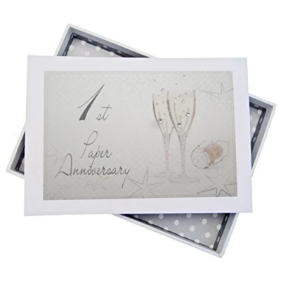 Beautiful handmade 1st Paper Anniversary Champagne Glasses photo album Presented in a white gift box with a clear Perspex lid Includes 16 pockets to hold up to 32 photos Hand finished with gorgeous diamantes and sparkling glitter The perfect gift for your special occasion