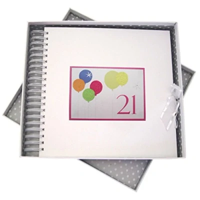 Beautiful handmade 21st Birthday Neon Glitter Balloons card & memory book Spiral bound allowing the book to expand and be filled with cards and other special memories Includes approximately 40 blank pages and presented in a white gift box with a lid Hand finished with gorgeous diamantes and sparkling glitter The perfect gift for your special occasion
