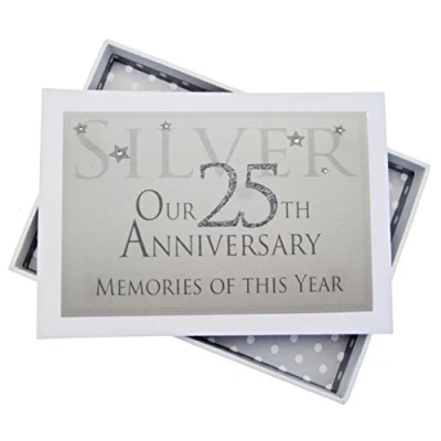 Beautiful handmade 25th Silver Anniversary Memories of This Year, Glitter & Words, photo album Presented in a white gift box with a clear perspex lid Includes 16 pockets to hold up to 32 photos Hand finished with gorgeous diamantes and sparkling glitter The perfect gift for your special occasion