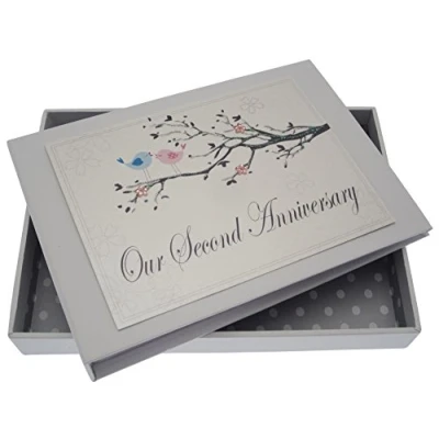 Beautiful handmade 2nd Anniversary Love Birds photo album Presented in a white gift box with a clear perspex lid Includes 16 pockets to hold up to 32 photos Hand finished with gorgeous diamantes and sparkling glitter The perfect gift for your special occasion