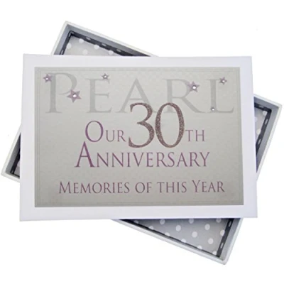 Beautiful handmade 30th Pearl Anniversary Memories of This Year, Glitter & Words, photo album Presented in a white gift box with a clear perspex lid Includes 16 pockets to hold up to 32 photos Hand finished with gorgeous diamantes and sparkling glitter The perfect gift for your special occasion