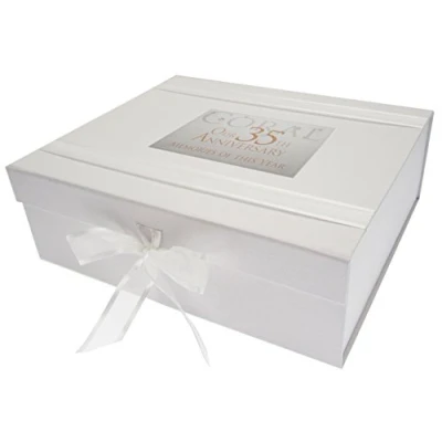 Beautiful handmade 35th Coral Anniversary Memories of This Year, Glitter & Words, Large Keepsake Box Large keepsake box with organza ribbon ties and magnetic seal Measures 27.2x32x11cm Hand finished with gorgeous diamantes and sparkling glitter The perfect gift for your special occasion