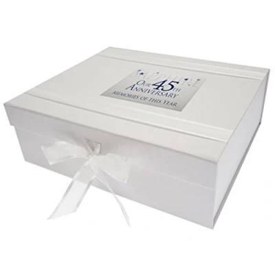 Beautiful handmade 45th Sapphire Anniversary Memories of This Year, Glitter & Words, Large Keepsake Box Large keepsake box with organza ribbon ties and magnetic seal Measures 27.2x32x11cm Hand finished with gorgeous diamantes and sparkling glitter The perfect gift for your special occasion