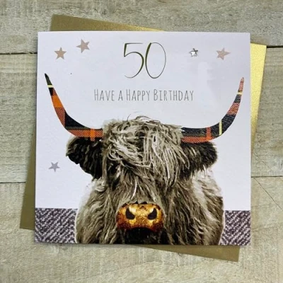 WHITE COTTON CARDS 50 HIGHLAND COW BIRTHDAY CARD, HAND FINISHED (S347 50)