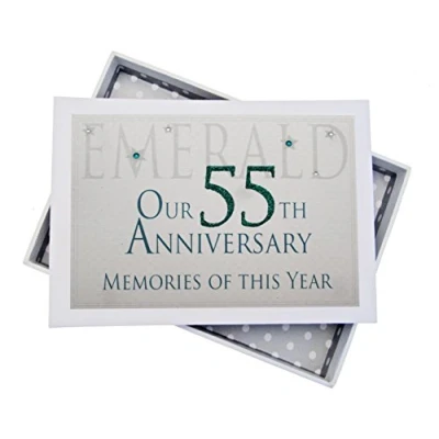 Beautiful handmade 55th Emerald Anniversary Memories of This Year, Glitter & Words, photo album Presented in a white gift box with a clear perspex lid Includes 16 pockets to hold up to 32 photos Hand finished with gorgeous diamantes and sparkling glitter The perfect gift for your special occasion