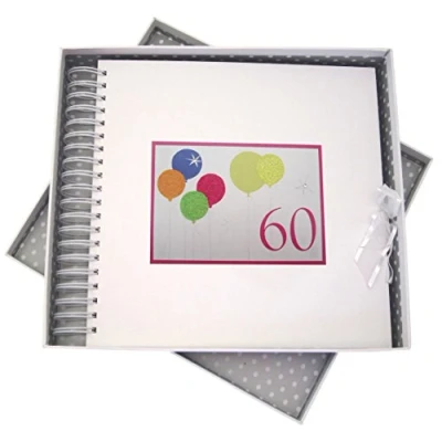 Beautiful handmade 60th Birthday Neon Glitter Balloons card & memory book Spiral bound allowing the book to expand and be filled with cards and other special memories Includes approximately 40 blank pages and presented in a white gift box with a lid Hand finished with gorgeous diamantes and sparkling glitter The perfect gift for your special occasion