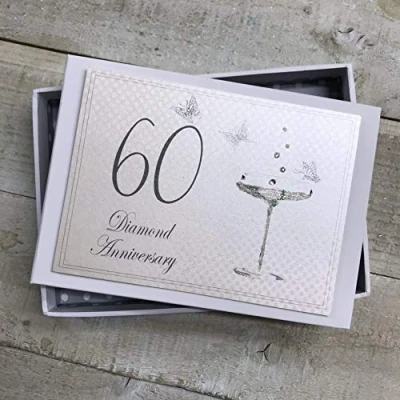 Beautiful handmade 60th Diamond Anniversary Champagne Glasses Anniversary Champagne Glasses photo album Presented in a white gift box with a clear perspex lid Includes 16 pockets to hold up to 32 (6"X 4") photos Hand finished with gorgeous diamantes and sparkling glitter The perfect gift for your special occasion