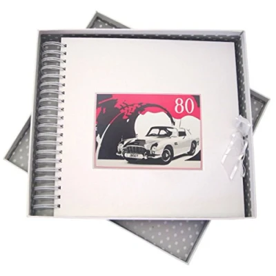 Beautiful handmade 80th Birthday Classic Car card & memory book Spiral bound allowing the book to expand and be filled with cards and other special memories Includes approximately 40 blank pages and presented in a white gift box with a lid Hand finished with gorgeous diamantes and sparkling glitter The perfect gift for your special occasion