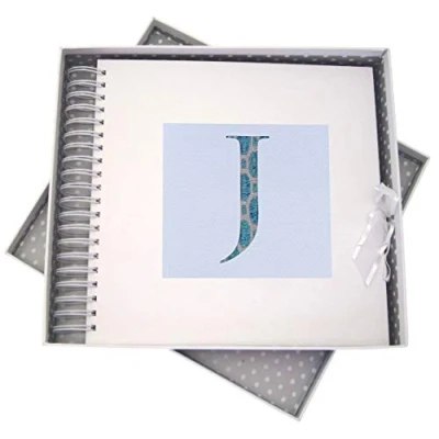 Beautiful handmade Alphabetic Initial J card & memory book Spiral bound allowing the book to expand and be filled with cards and other special memories Includes approximately 40 blank pages and presented in a white gift box with a lid A stylish patterned fabric motif printed onto a crisp white textured plaque, mounted onto a card & memory book The perfect gift for your special occasion