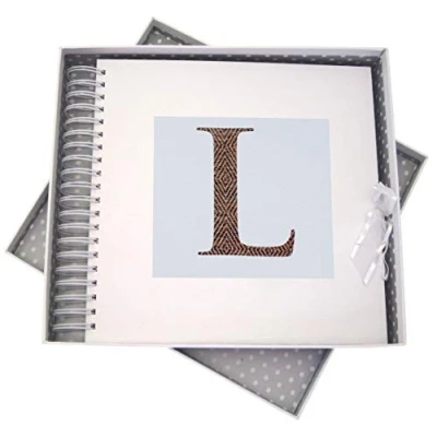 Beautiful handmade Alphabetic Initial L card & memory book Spiral bound allowing the book to expand and be filled with cards and other special memories Includes approximately 40 blank pages and presented in a white gift box with a lid A stylish patterned fabric motif printed onto a crisp white textured plaque, mounted onto a card & memory book The perfect gift for your special occasion