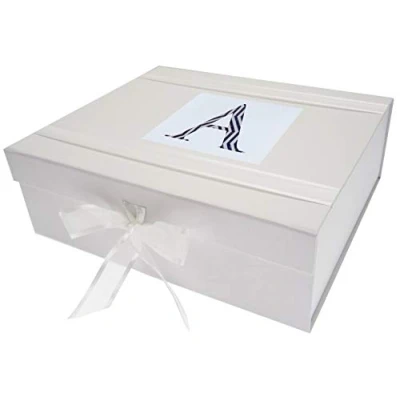 Beautiful handmade Alphabetics Initial A large keepsake box Large keepsake box with organza ribbon ties and magnetic seal Measures 27.2x32x11cm A stylish patterned fabric motif printed onto a crisp white textured plaque, mounted onto a keepsake box The perfect gift for your special occasion