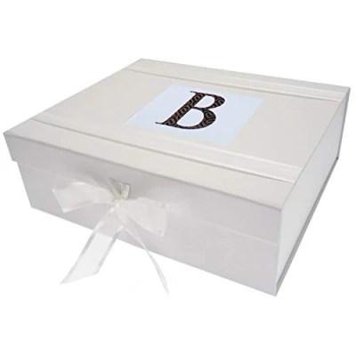 Beautiful handmade Alphabetic Initial B large keepsake box Large keepsake box with organza ribbon ties and magnetic seal Measures 27.2x32x11cm A stylish patterned fabric motif printed onto a crisp white textured plaque, mounted onto a keepsake box The perfect gift for your special occasion