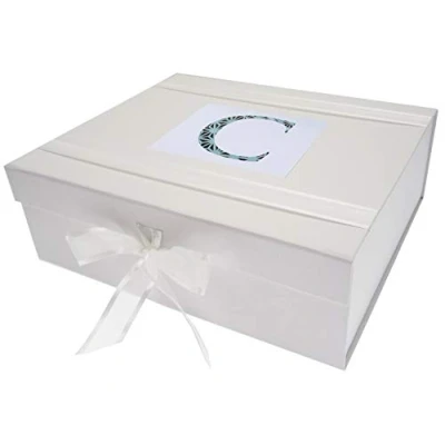 Beautiful handmade Alphabetics Initial C large keepsake box Large keepsake box with organza ribbon ties and magnetic seal Measures 27.2x32x11cm A stylish patterned fabric motif printed onto a crisp white textured plaque, mounted onto a keepsake box The perfect gift for your special occasion