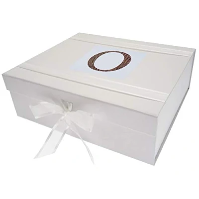 Beautiful handmade Alphabetic Initial O large keepsake box Large keepsake box with organza ribbon ties and magnetic seal Measures 27.2x32x11cm A stylish patterned fabric motif printed onto a crisp white textured plaque, mounted onto a keepsake box The perfect gift for your special occasion