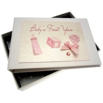 Gorgeous Baby Memory Item 16 plastic sleeves - holds 28 photos Boxed in top quality white foiled box with perspex lid Perfect for a special Occassion Finished with Diamonds & Glitter