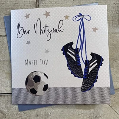 WHITE COTTON CARDS Bar Mitzvah Mazel Tov Boys Handmade Jewish Card, Football and Boots, JE319