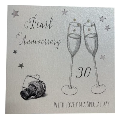 white cotton cards Champagne Glasses Pearl Handmade 30th Anniversary Card, White, WA30, 16cm x