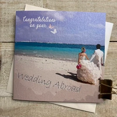 WHITE COTTON CARDS CONGRATULATIONS ON YOUR WEDDING ABROAD BEACH & COUPLE CARD, HAND FINISHED (D350)