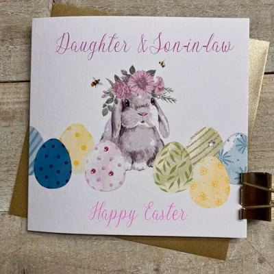 WHITE COTTON CARDS DAUGHTER & SON IN LAW BUNNY PINK FLOWERS EGGS EASTER CARD, HAND FINISHED (E24 13 DS)