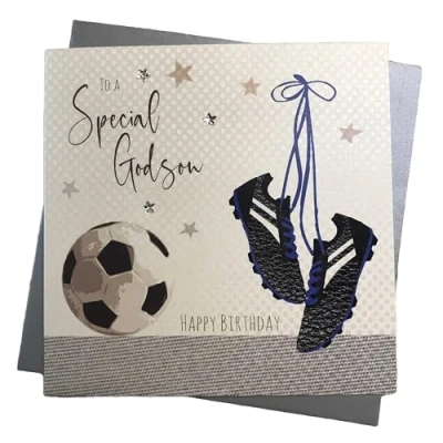 WHITE COTTON CARDS Football to A Special Godson Handmade Birthday Card, SB35,16cm x 16cm
