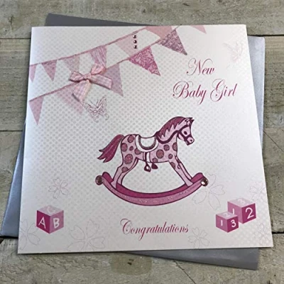 WHITE COTTON CARDS Girl Congratulations, Handmade Large New Baby Card (Pink, Rocking Horse & Bunting)