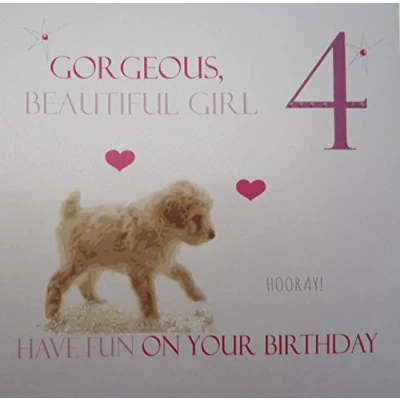 White Cotton Cards Gorgeous Beautiful Girl 4 Have Fun, Handmade Large 4th Birthday Card (Puppy)
