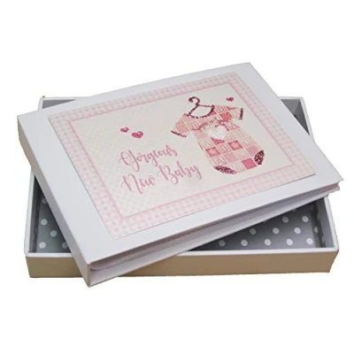 Beautiful handmade new baby pink Babygro photo album Presented in a white gift box with a clear Perspex lid Includes 16 pockets to hold up to 32 photos Hand finished with gorgeous diamantes and sparkling glitter. The perfect gift for your special occasion