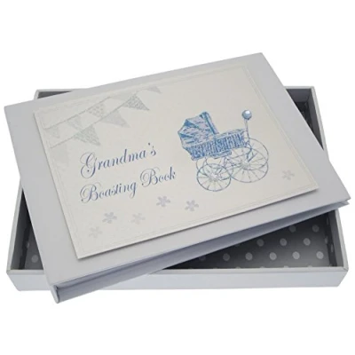 Beautiful handmade Grandma's Boasting Book Blue Pram & Bunting photo album Presented in a white gift box with a clear perspex lid Includes 16 pockets to hold up to 32 (6"x 4")photos Hand finished with gorgeous diamantes and sparkling glitter The perfect gift for your special occasion