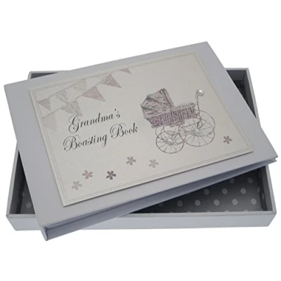 Beautiful handmade Grandma's Boasting Book Silver Pram & Bunting photo album Presented in a white gift box with a clear perspex lid Includes 16 pockets to hold up to 32 (6"X 4") photos Hand finished with gorgeous diamantes and sparkling glitter The perfect gift for your special occasion
