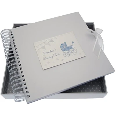 Beautiful handmade Grandma's Boasting Book Blue Pram & Bunting card & memory book Spiral bound allowing the book to expand and be filled with cards and other special memories Includes approximately 40 blank pages and presented in a white gift box with a lid Hand finished with gorgeous diamantes and sparkling glitter The perfect gift for your special occasion